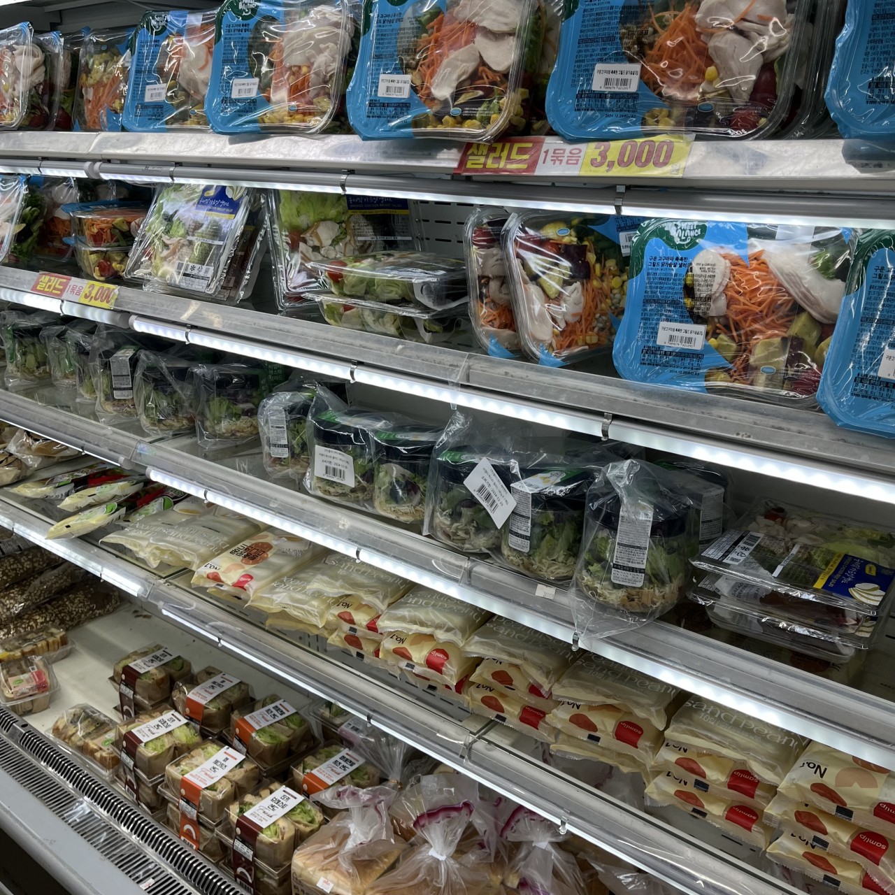 샐러드, 샌드위치, 과일, 냉장식품, 음료수 야채, 채소 등 입니다.